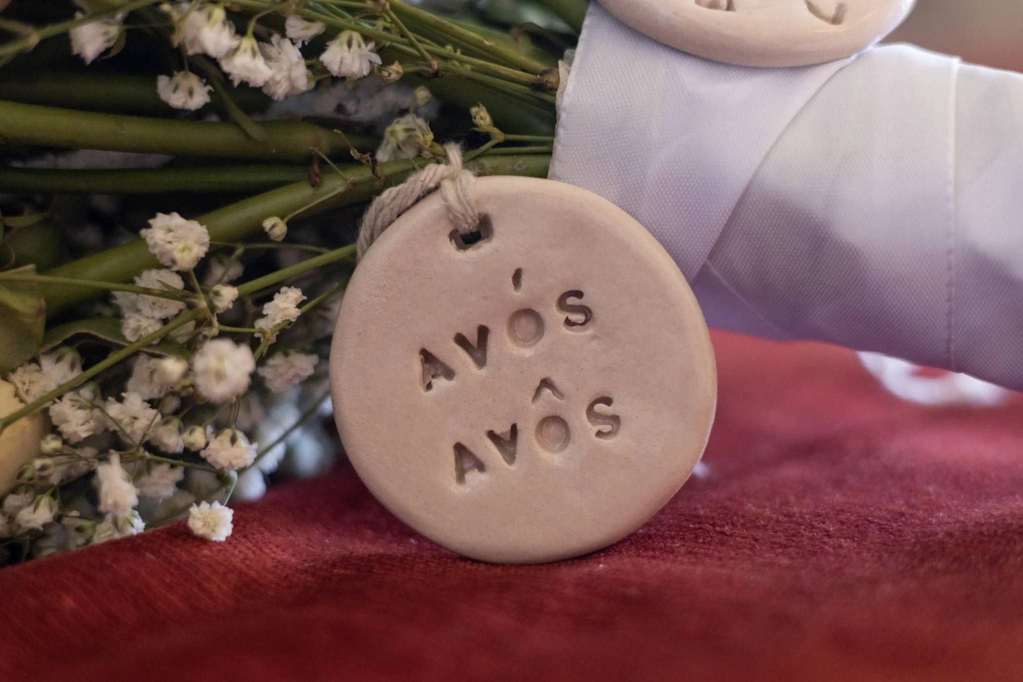 Estas 2 pequenas medalhas em cerâmica, feitas à mão, eternizam palavras e emoções para o grande dia da noiva.